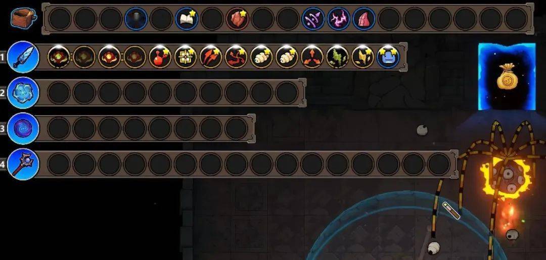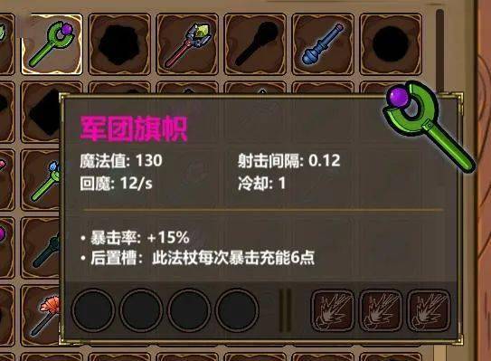 例如这根以暴击作为触发条件的法杖,理论上来说只要前面4格法术暴击触发得足够快,后面3格的法术就能无限释放,彻底无视蓝耗和CD这两大限制。