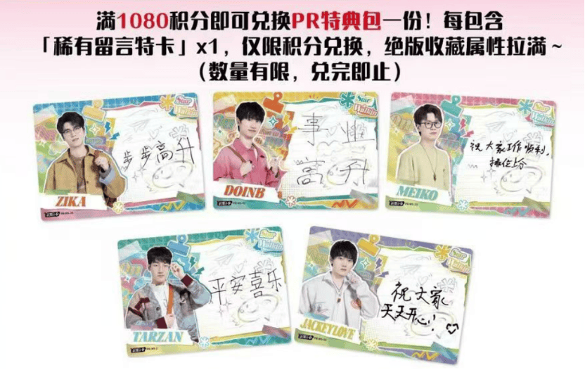 比如在八月下旬推出的《LPL星火选手卡》中,就出现了带有选手专拍素材的拍立得特卡,以及带有选手亲笔留言的留言特卡。两种特卡分别只能通过抽卡和积分兑换的方式获取,对愿意付出足够情感投入的粉丝而言,其收藏价值之高不言而喻。