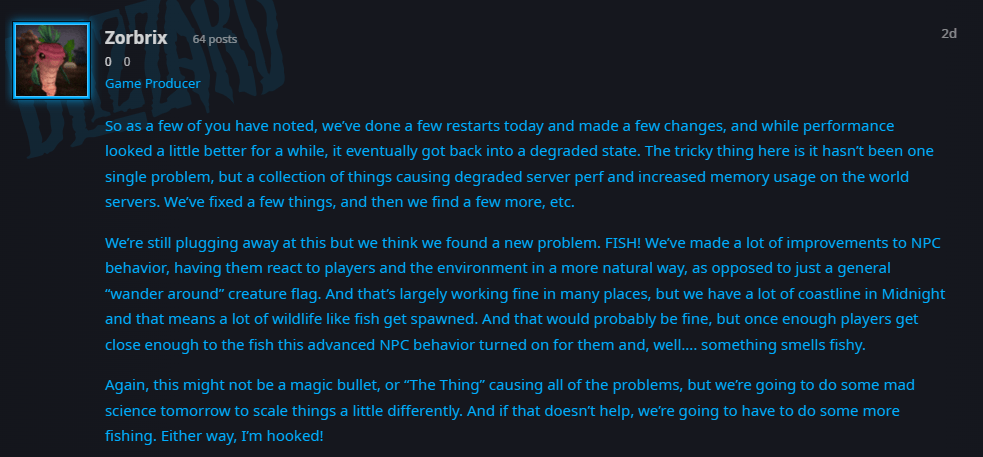 游戏制作人Zorbrix发帖称,团队自B测上线以来一直寻找导致性能下降的根源。经过大量调查,发现问题出在鱼类。因为新版本改进了游戏中NPC的行为模式,而12.0新增很多海岸线和鱼类,由此产生大量运算,造成整个服务器性能的下滑。