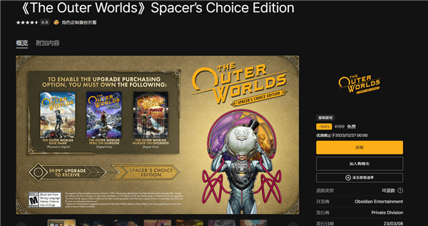 今天赠送的游戏为科幻RPG《天外世界:太空人之选》,原价199元,限时一天免费领取(点此领取)。