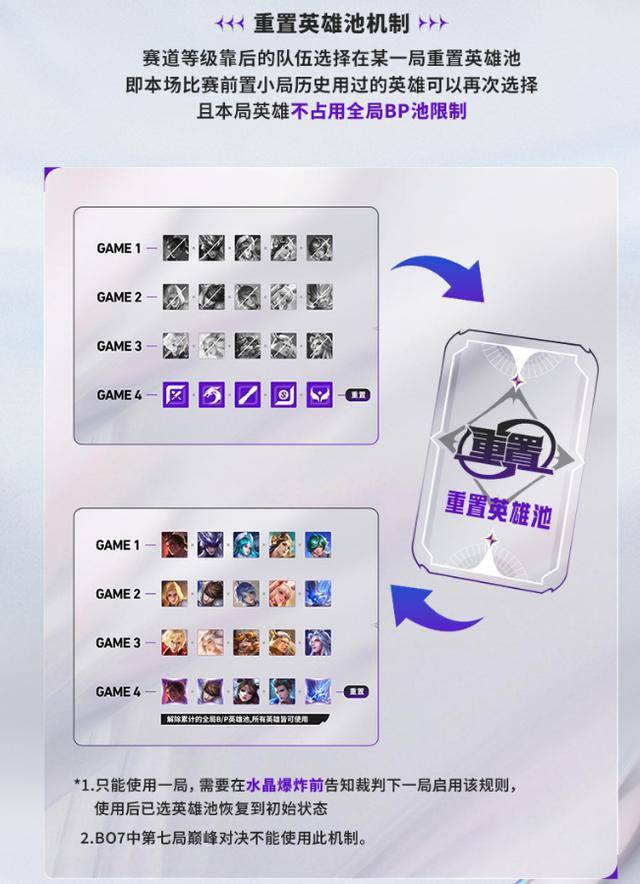 第二个机制是重置英雄池。这个机制就是在某一局可以选择把之前用过的英雄全部重置,而且是所有用过的英雄都重置了。比如我前面用了鲁班父子,沈梦溪加曹操,但不是在同一局用的,这次都可以重新拿出来组合在一起。相当于对手需要重新考虑ban位。