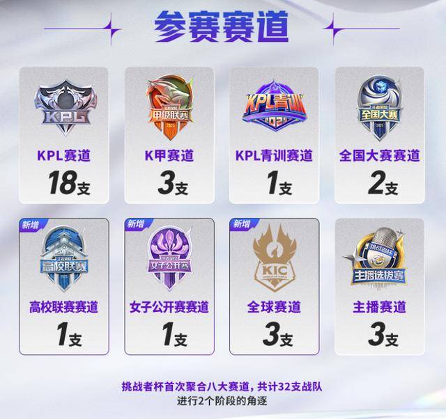 12月6日挑战者杯就将正式开赛,本次挑杯和以往都不一样,首先参赛队伍32支是历届之最,所有18支KPL战队都能参赛,还包括K甲,全国大赛,女子赛,高校赛,主播联赛,青训和海外战队,基本上是所有能包含的都含了。
