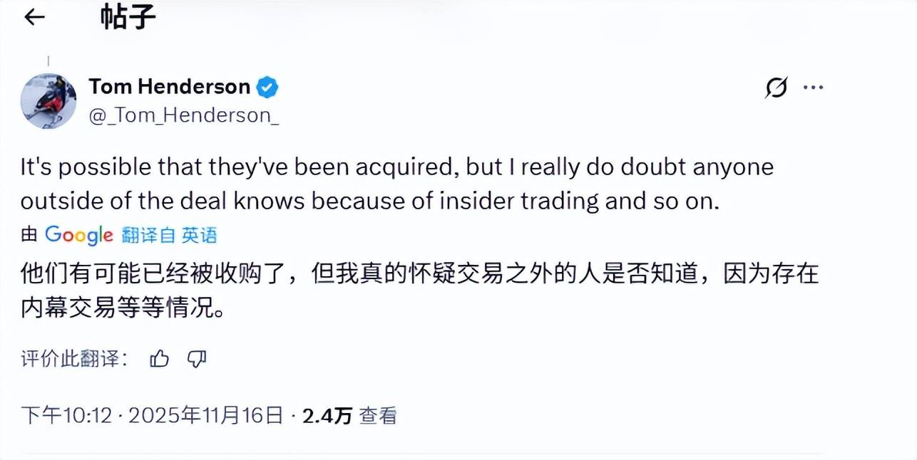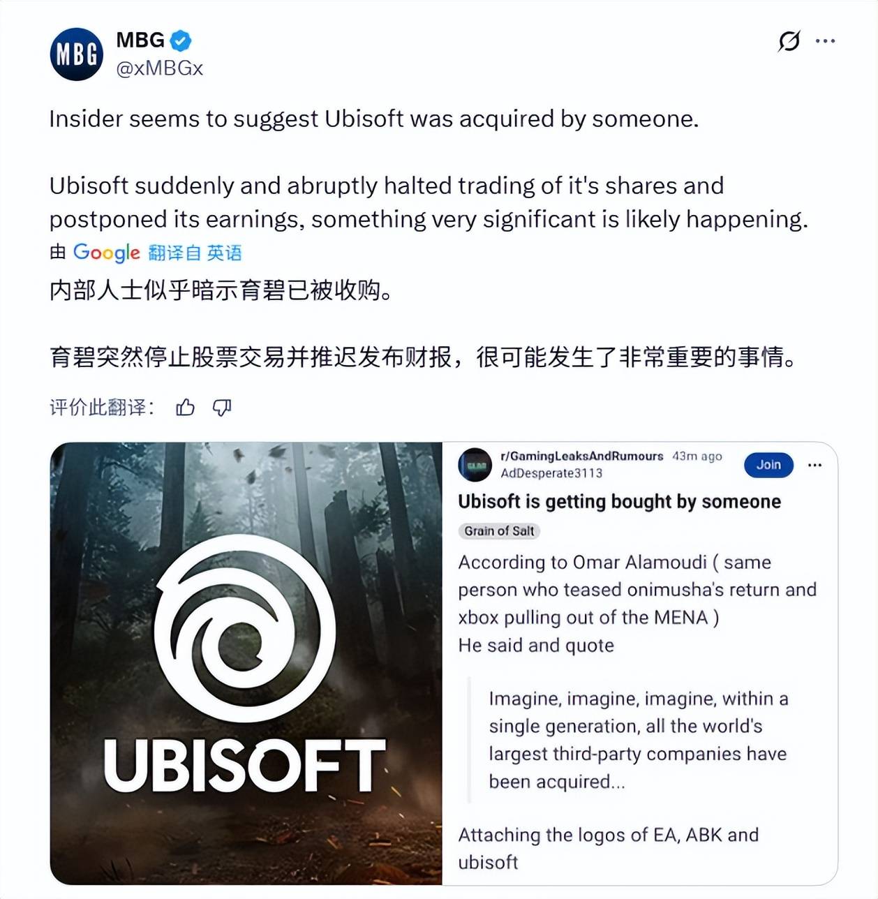 而就在不久前,推主MBG也发文表示:“有内部人士暗示育碧已经被某方收购了”。同时知名爆料人Tom Henderson在评论区回应:“可能他们已经被收购了,但我真的怀疑在交易之外有人知道这件事,因为涉及到内部交易之类的原因。”