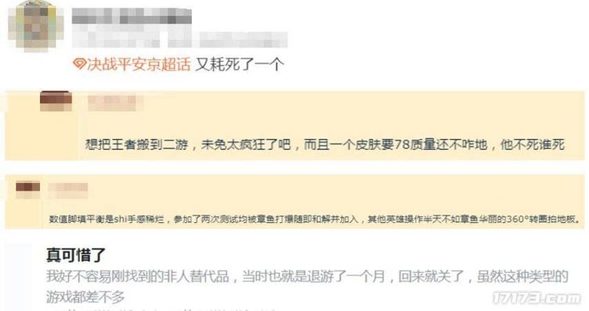 对于游戏的停运,有网友调侃,网易的《决战平安京》又耗死了一个竞争对手。也有网友表示,二游版王者这想法很疯狂,但是一个皮肤要78,它不死谁死?还有玩过的网友表示,这游戏手感稀烂,游戏平衡差,有时候打半天结果反被对方英雄一招拍死。