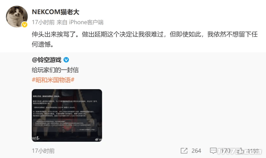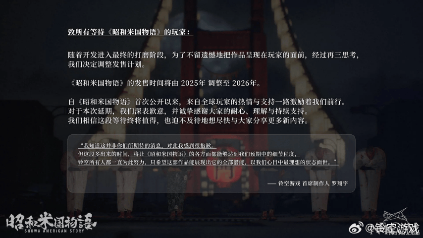 11月12日,铃空游戏突然发布一则公告,称《昭和米国物语》的发售日期将会从2025年跳票至2026年。