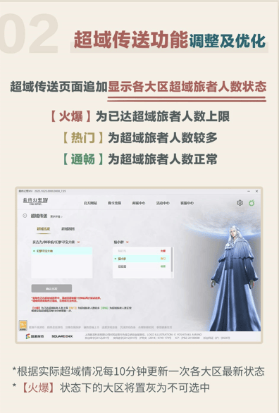 最后则为本次传送的重点信息!超域传送功能的优化现已上线。在超域传送的页面中将追加显示各大区超域旅者人数状态等信息,各位冒险者可根据各大区的人数信息,在不同时段选择区服进行游玩,还请各位冒险者特别留意啦!