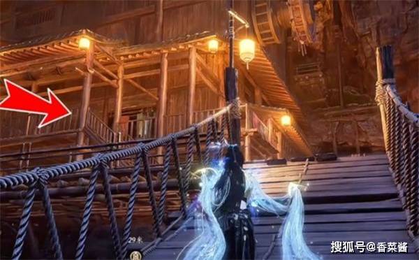 3、从左侧木桥跳下,沿台阶上行