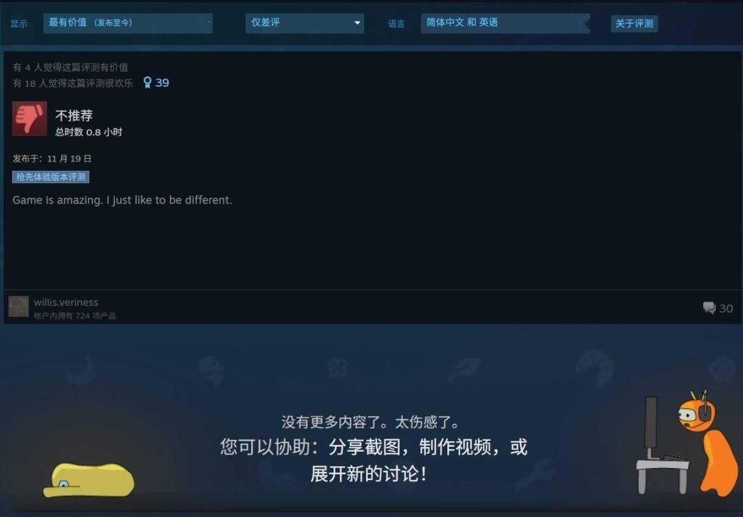 然而,在11月19日,某玩家提交了第一条差评。该评论写道"游戏非常棒。我只是想与众不同",似乎在称赞游戏质量的同时,表示自己只是想与其他用户不同,故而特意给出了差评。