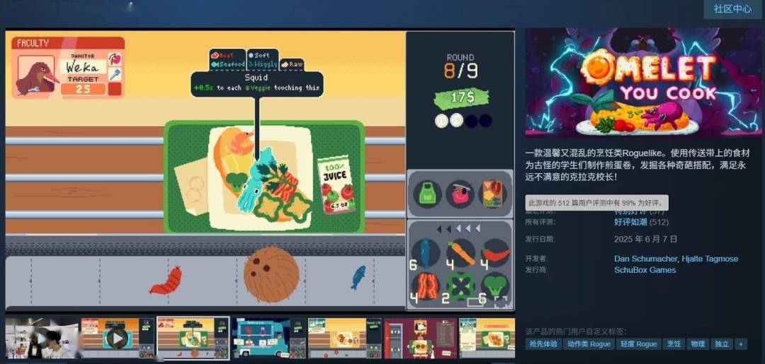 《Omelet You Cook》是一款烹饪类的卡牌肉鸽游戏,玩家将扮演学校食堂的厨师,在满足个性丰富学生们要求的同时完成料理。本作于2025年6月8日以抢先体验形式发布的作品。开发工作由两人组成的独立工作室负责。玩家们对其短时间内即可享受的爽快游戏节奏、轻松的艺术风格以及丰富的内容给予了高度评价。自发售日以来,游戏获得了500多条评论,其中无一例外全是好评。