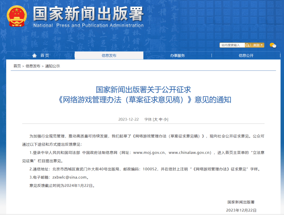 2023年即将收尾时,游戏行业来了一个大震荡。近日,国家新闻出版署发布了《网络游戏管理办法(草案征求意见稿)》(以下简称《意见稿》)引发热议,内容涉及游戏模式、收费模式、版号、游戏内容、防沉迷等多个方面,该意见稿也对网络游戏的出版经营、未成年人保护等方面提出具体要求。据了解,《意见稿》共8章64条,反馈截止时间为2024年1月22日。