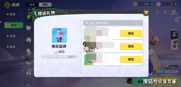 4、这里不太推荐赠送皮肤,大部分皮肤都可以使用云朵币免费兑换,但是赠送需要氪金,并不划算。
