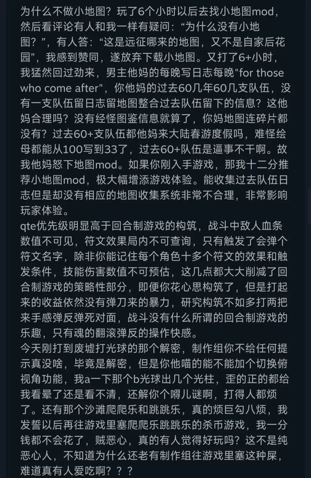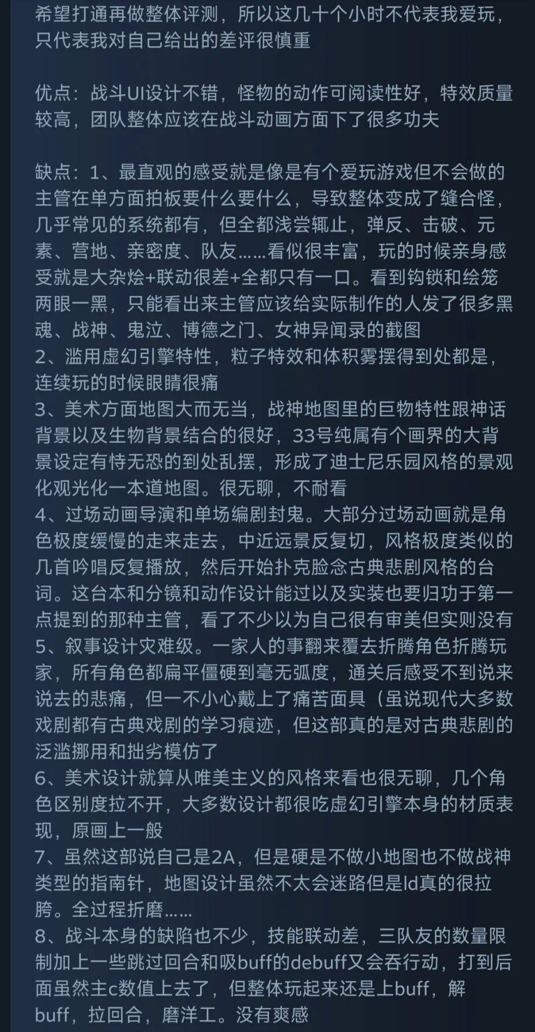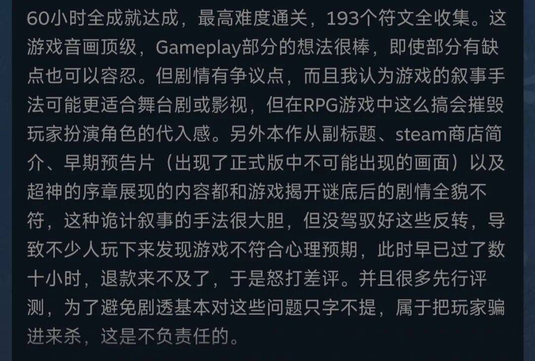 除了给剧情一百万个差评以外,也有玩家在写出超长差评的同时,肯定了音画方面的成就。怎么说呢,爱之深恨之切啊……