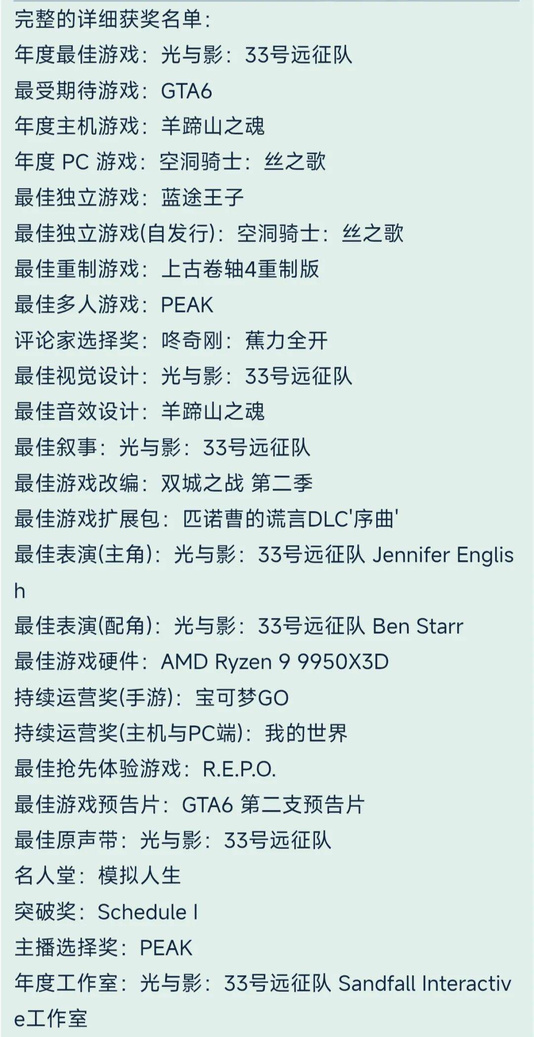 虽然金摇杆奖举办至今已有43届——本届就是43届,但这么多《光与影:33号远征队》,还是给姬一种将43届幻视成33届的感觉。