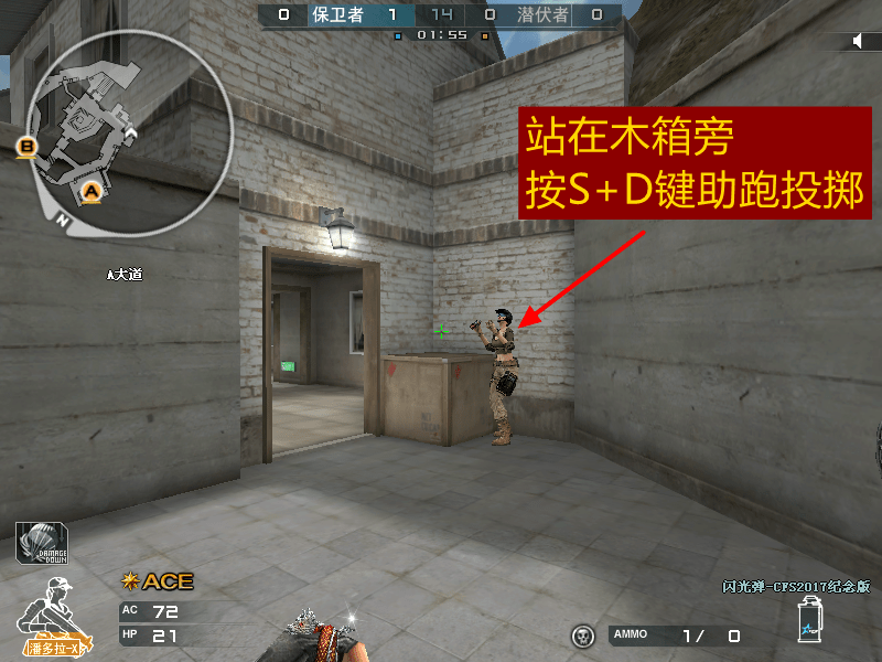 作为潜伏者的我们可以先在A拐小房里投掷这颗烟雾弹。如上图所示,我们可以站在木箱旁,并按住S+D键助跑投掷烟雾弹。