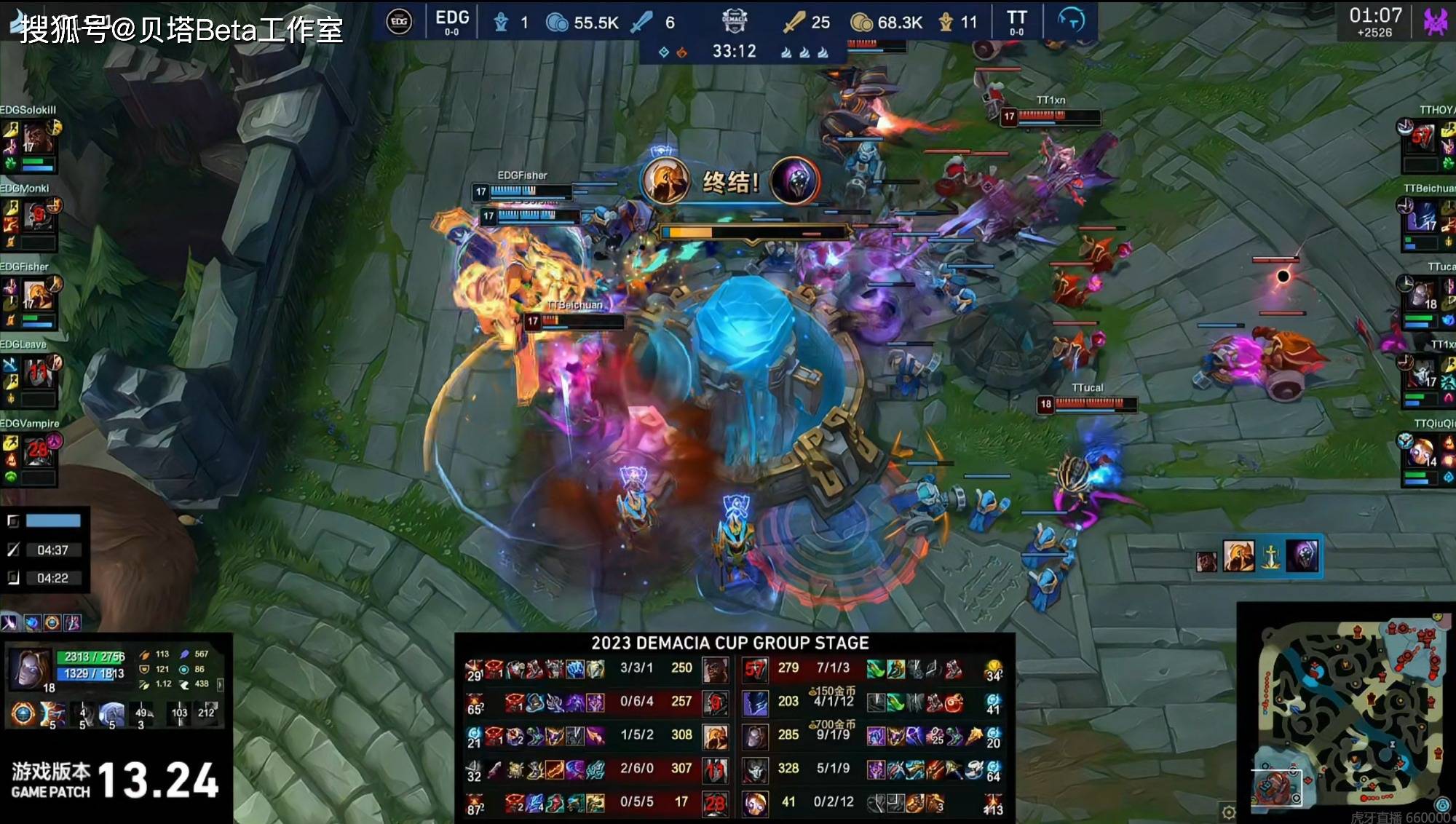 第一局EDG迎战TT,除了上单发挥不错之外,其他位置都疯狂失误,TT这边辅助选出了机器人,可以说是把EDG的几个人完全限制了,钩子的命中率非常高,EDG这边走位失误很严重,最终首局惨败。
