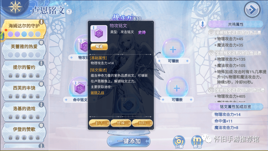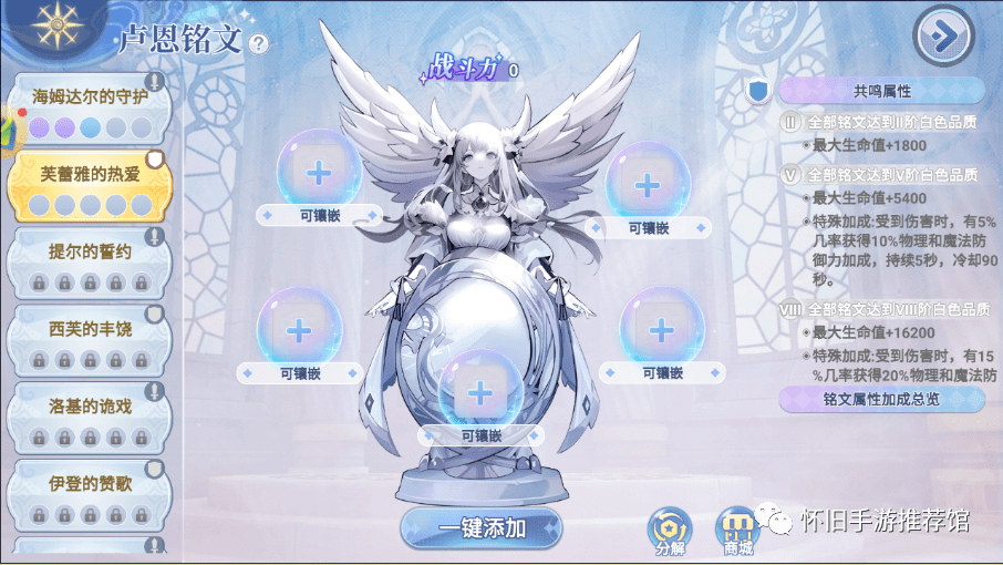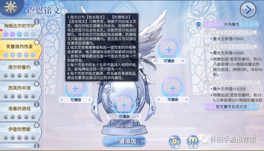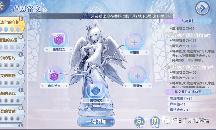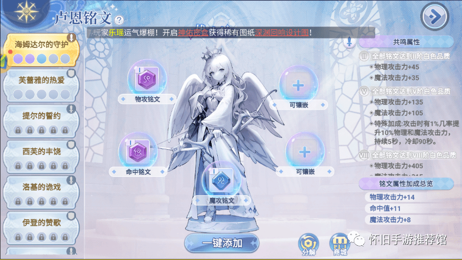 卢恩铭文当初心者们的等级角色打到50级时,会自行开启该功能,初始状态下会开启「海姆达尔的守护」和「芙蕾雅的热爱」两个女神雕像,每座雕像有5个孔,每个孔可以镶嵌一个铭文,铭文可以对角色进行基础属性的提升。