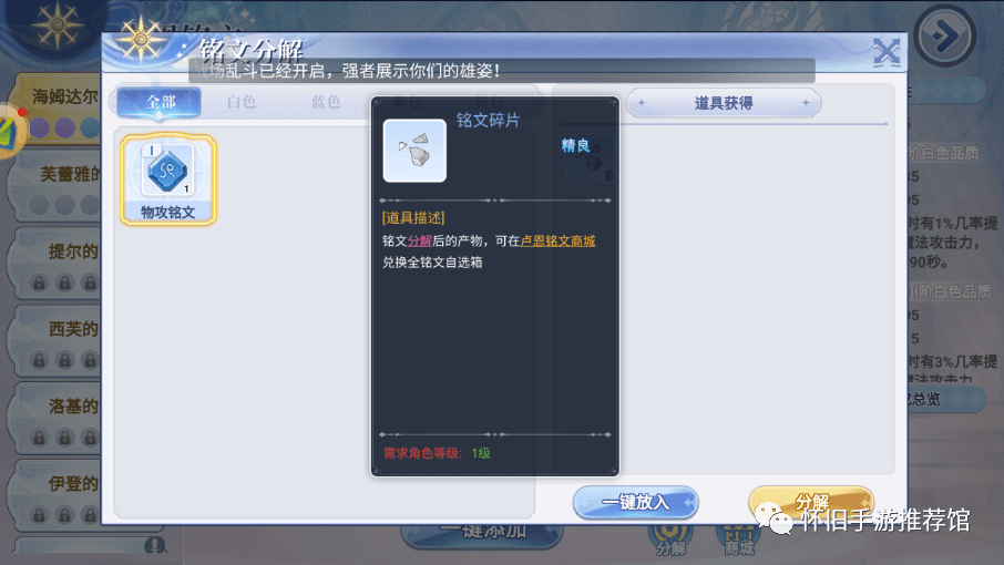 如果我们有 多余的铭文 碎片的话,可以考虑分解,分解不同品质的铭文可以获得不同数量的铭文碎片,获取到的铭文碎片可以到卢恩铭文商城兑换全铭文自选箱