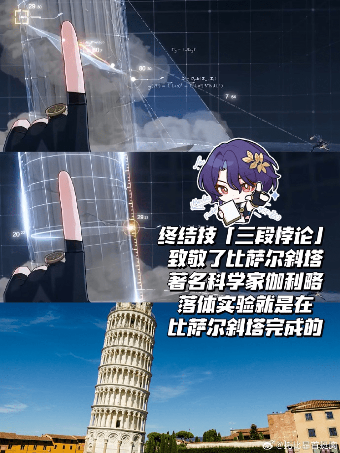 还有终结技“三段悖论”,出自亚里士多德的三段论。而终结技中出现的比萨斜塔,早在1589年伽利略就在比萨斜塔公开进行自由落体实验,推翻了亚里士多德曾论证的“下落速度与物品重量成正比”的观点,并提出了重力加速度的概念。
