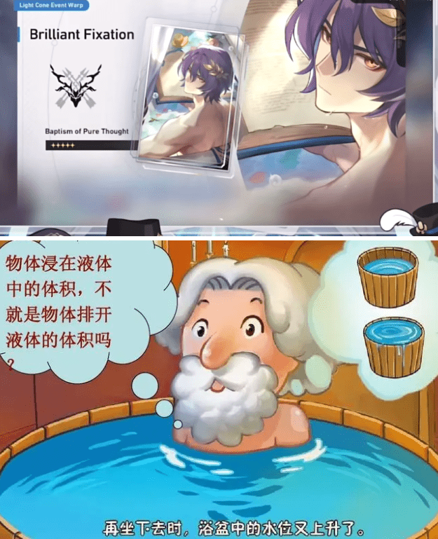 而上面提到的“洗澡水”光锥纯粹思维的洗礼,则是致敬了阿基米德发现浮力公式的故事: