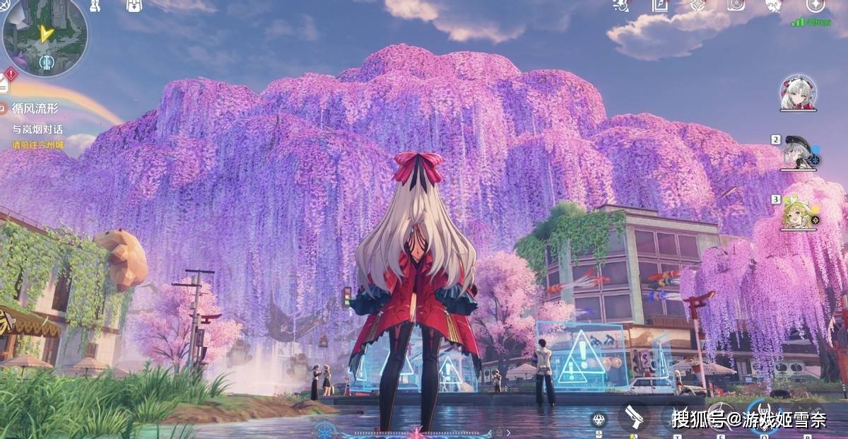 库洛为了打造心中的梦核世界,新穗波市在设计上加入的植被数量简直可以用恐怖来形容,咖啡厅旁边的巨大紫藤树随着微风起舞,随处可见的樱花落叶铺满街道,随着漂子的经过带动飘飞。先前的环境互动仅限于轻轻带动的水准,而让鉴心来新穗波这么一卷立马就有太极张三丰的感觉,即使没有被风带动,环境中也四处都是从天而降的花瓣与粒子,那种感觉就像是我正站在新海诚拍的新电影里,为了解决世界的某种危机和某位有特殊能力的女孩子展开冒险,相互帮扶逐渐有了感情,最后在满天的樱花下表白,对于老二次元来说做上一次日本高中生的恋爱梦真的很甜蜜啊。