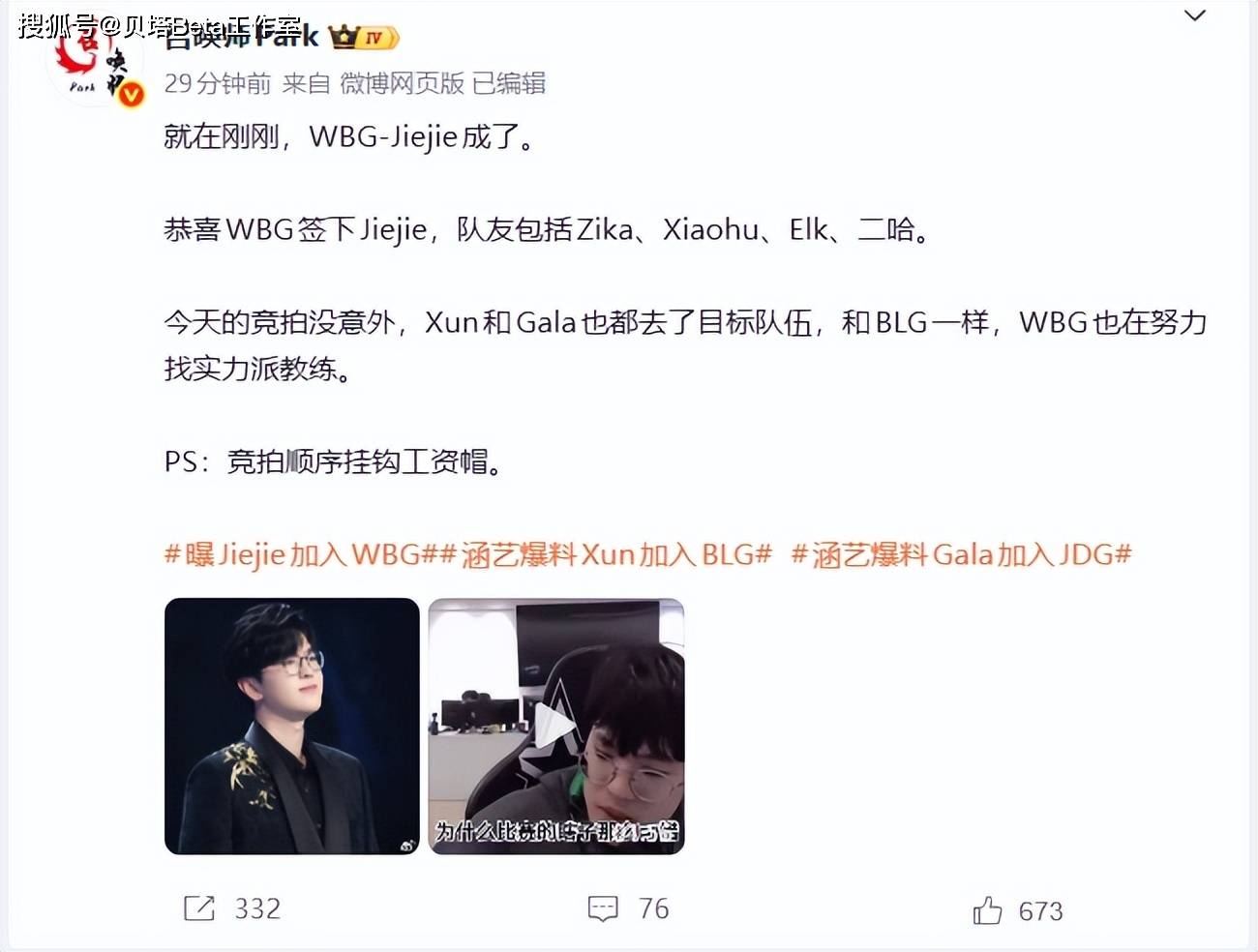 之后另一位爆料人召唤师Park透露:WBG也签下了jiejie,新阵容是上单Zika,打野jiejie,中单小虎,下路ELK加Erha,目前WBG还在寻找实力派教练,BLG也是在找教练。