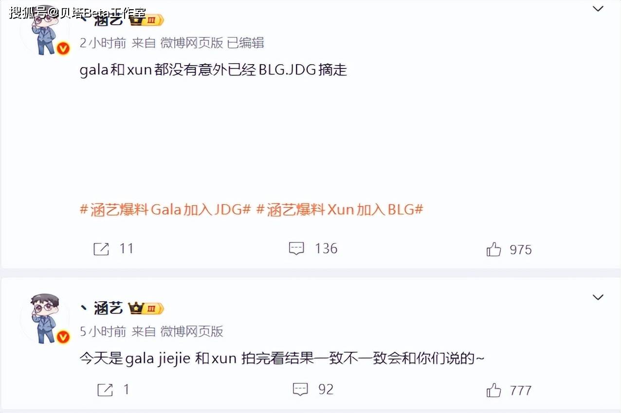 首先是涵艺爆料:Gala、jiejie和xun都将在这一天完成竞拍,Gala去了JDG,xun去了BLG,没有任何意外。