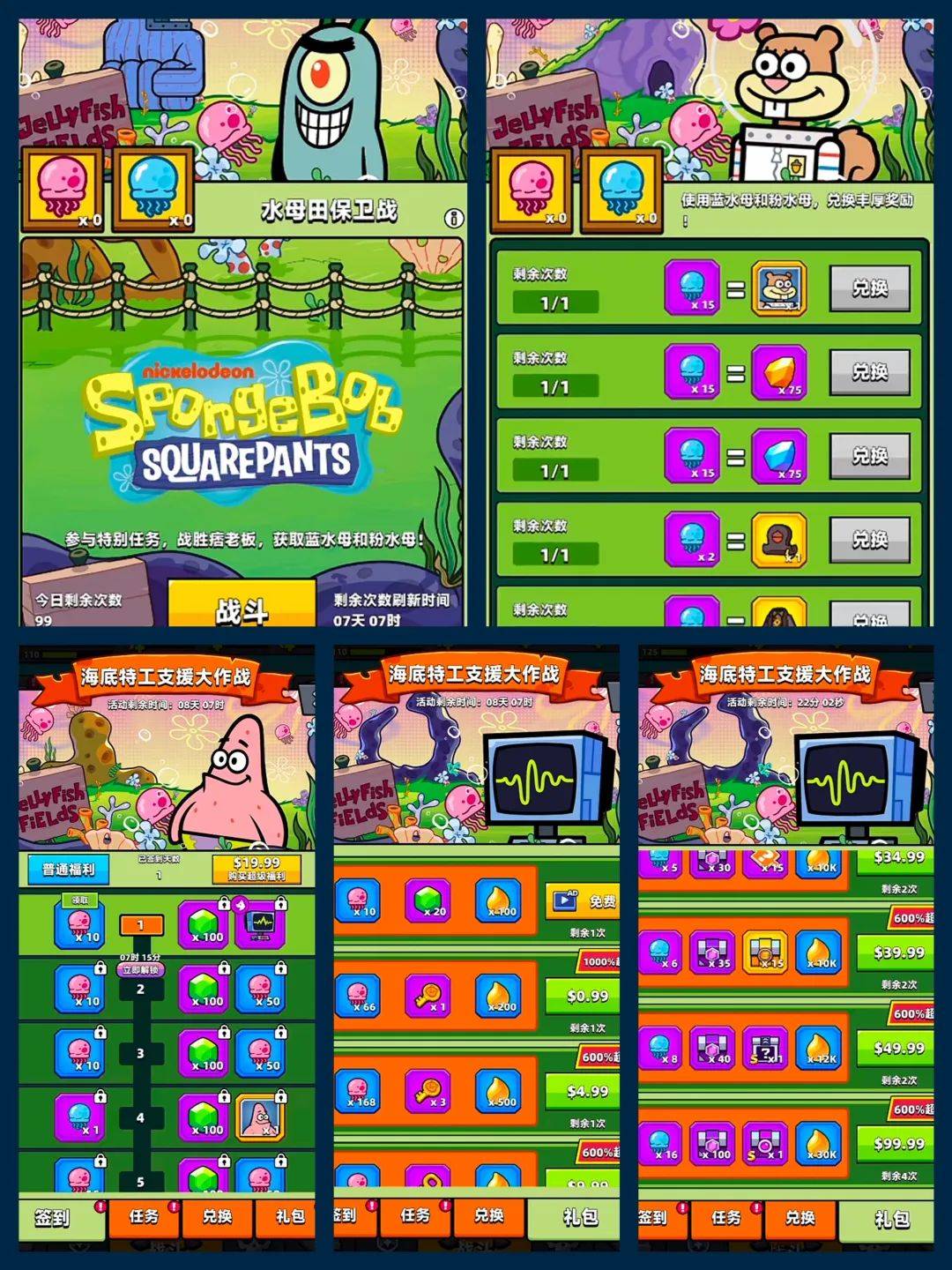 玩法:参加一个海底副本,完成后奖励道具水母,水母可以兑换海绵宝宝、章鱼哥、姗迪这些特工角色。
