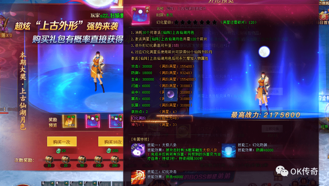 仙湖月色阵法 只能通过限时活动上古外形获得,20灵玉购买一个礼包可以开出1-30个上古外形兑换券或者1个仙阵碎片,也有几率直接开出30个碎片,兑换券可以在商店中兑换奖励,100张兑换券可以换一个仙阵碎片,累计购买礼包可以获得额外的次数奖励,最高1000次,也就是2W仙玉光是次数奖励就可以拿到1700个兑换券和20个仙阵碎片。
