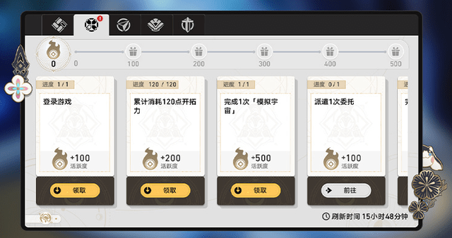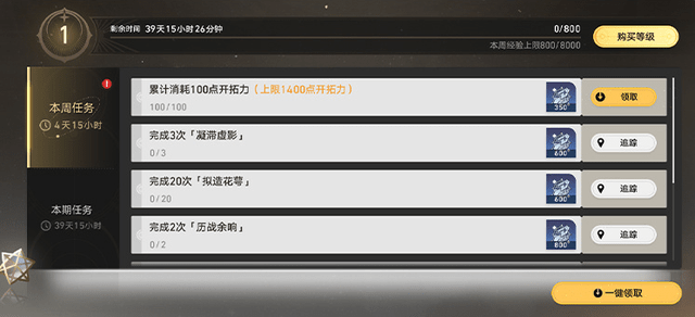 另外,每日实训的可选项也变多了。从6个变成了8个,内容上也变得更加简单,消耗体力也可以获取活跃度。如果赶时间的话,模拟宇宙世界一直接速通,就能拿满星琼和经验。这下真是上线2分钟就能清完日常。