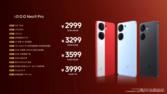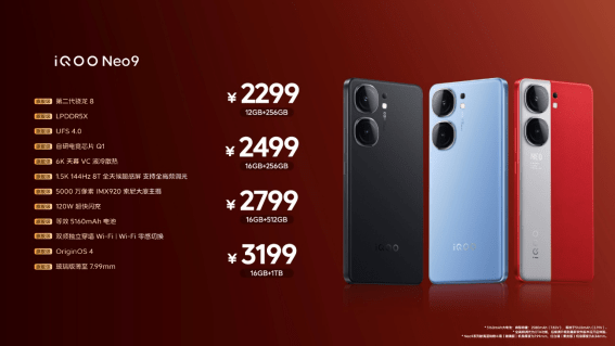 iQOO Neo9系列共有红白魂、航海蓝、格斗黑三种配色,iQOO Neo9售价2299元起,iQOO Neo9 Pro售价2999元起。活动期间,iQOO WATCH、iQOO TWS 1e、iQOO 散热背夹 2促销优惠价分别为1049元起、159元、129元。