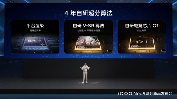 ,iQOO Neo9系列凭借自研电竞芯片Q1,结合自研V-SR超分算法,实现领先行业的PC级超分、“零感”时延以及稳定的超分超帧并发效果。