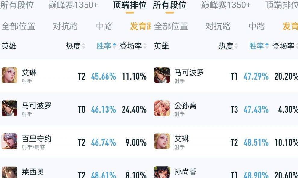 从12月27日王者营地的数据来看,艾琳的首日表现不太好,在出场率比较高的情况下,全分段是48.5%的胜率,高分段是45.7%的胜率,巅峰赛是46.7%的胜率。后续几天应该有反弹空间,sara认为艾琳在全分段的胜率会有所提升,但高分段就不好说了。因为高分段的游戏节奏很快,艾琳不管是抗压还是抢线,都不是一个强力的角色,优点是找个安全位置输出。