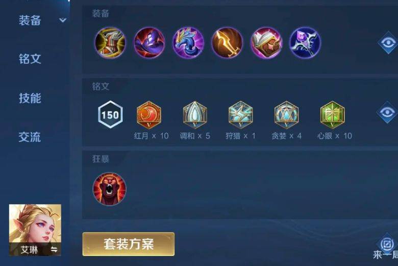 由于艾琳的普攻是物伤,技能是法伤,造成的是混合伤害,所以主流推荐铭文带法穿、暴击、移速、物理吸血和攻击力,千万不要带法术吸血。她具有全能穿透和吸血效果,现在的出装和传统射手比较相似,法穿鞋、影刃、无尽、破晓、逐日和吸血刀,如果遇到刺客的话可以出一件肉。至于末世、冰矛和日暮要不要出,目前还在研究中,纯法装主要是针对脆皮阵容。