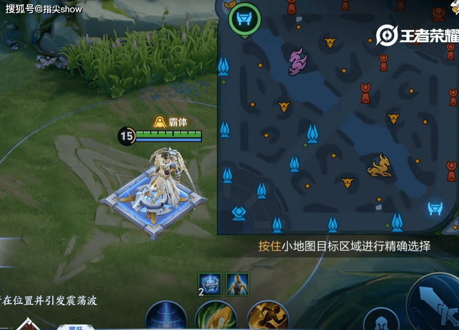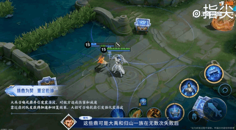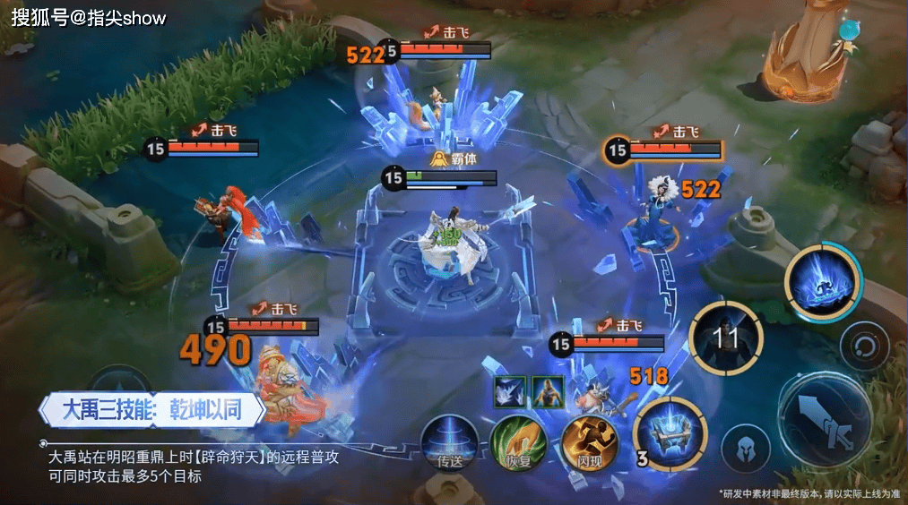 一技能的鼎可以放置八个(大招一个),大禹踩在鼎上的时候是霸体,同时点击回城可以传送到任意一个鼎上,落地后触发振动波,并击退附近目标,这个设定简直离谱,因为作为反制方,你想要抓大禹的落地,先手只能打伤害,而不能像传统传送一样,落地控死集火。