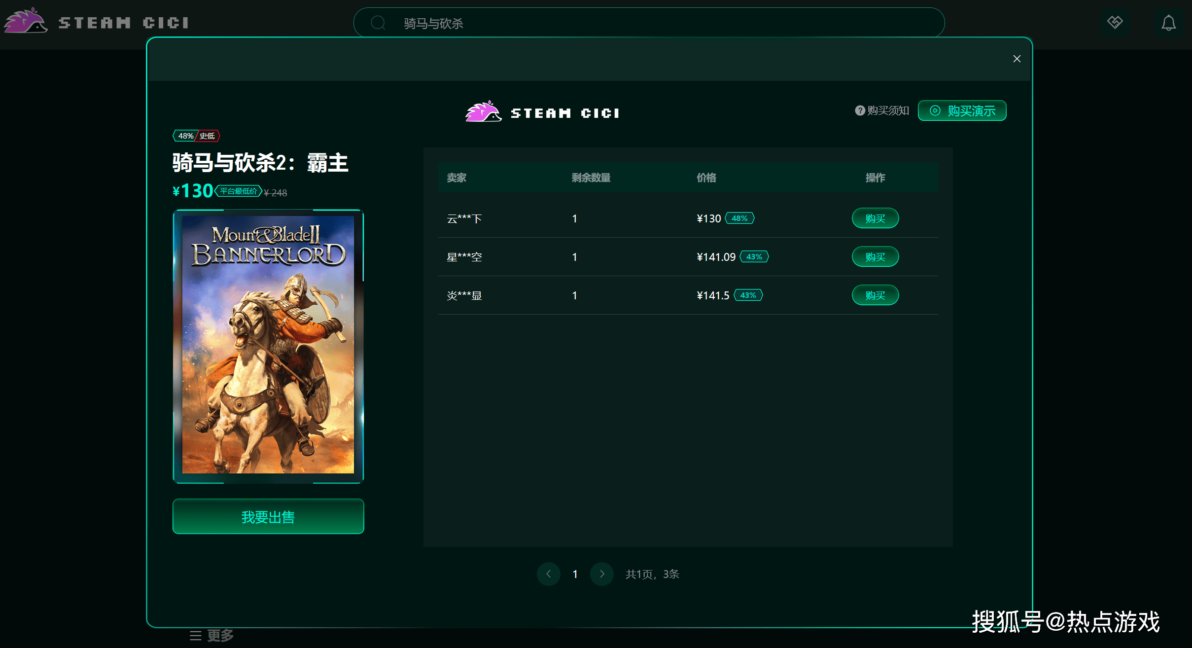接下来,我们只需要在steamcici网站搜索《骑马与砍杀2:霸主》,这时候系统就会自动跳出对应的游戏页面,打开后可以看到游戏价格、销售信息等一系列的内容。