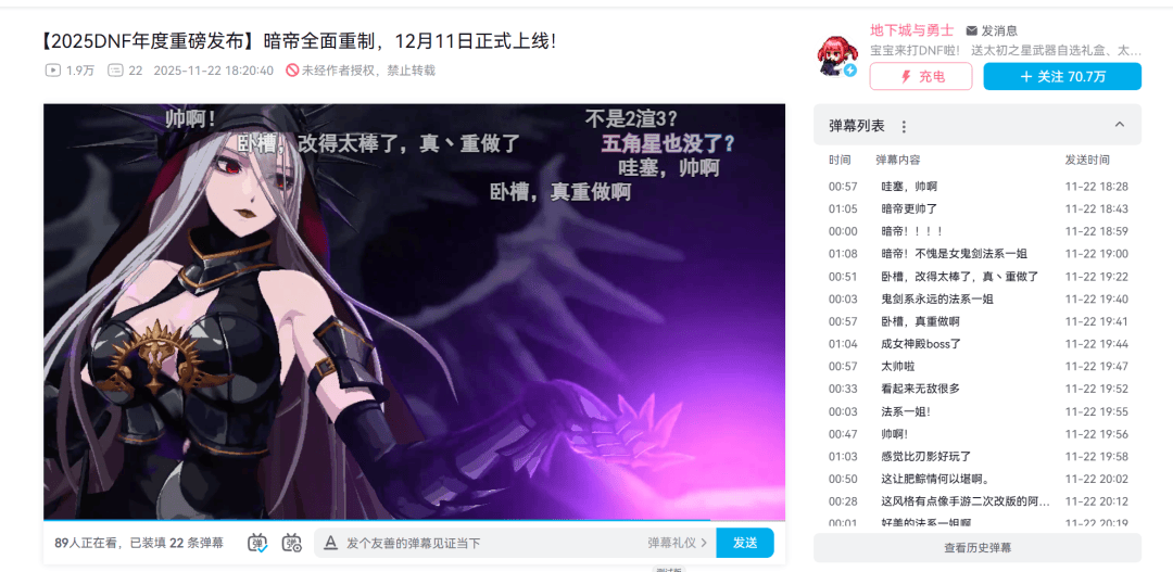 这其中最能调动玩家情绪的,还是职业暗帝 (暗殿骑士)的全面重做,从立绘到动画再到技能,而且是国服首发重做——相关视频弹幕和评论区几乎都是赞叹「DNF再次伟大」;
