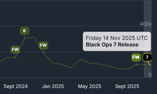 不论如何,残酷的现状是,这次BO7的Steam在线人数勉强维持在十万人,英国市场的实体首发销量较前作下降了61%,几乎可以说是腰斩。