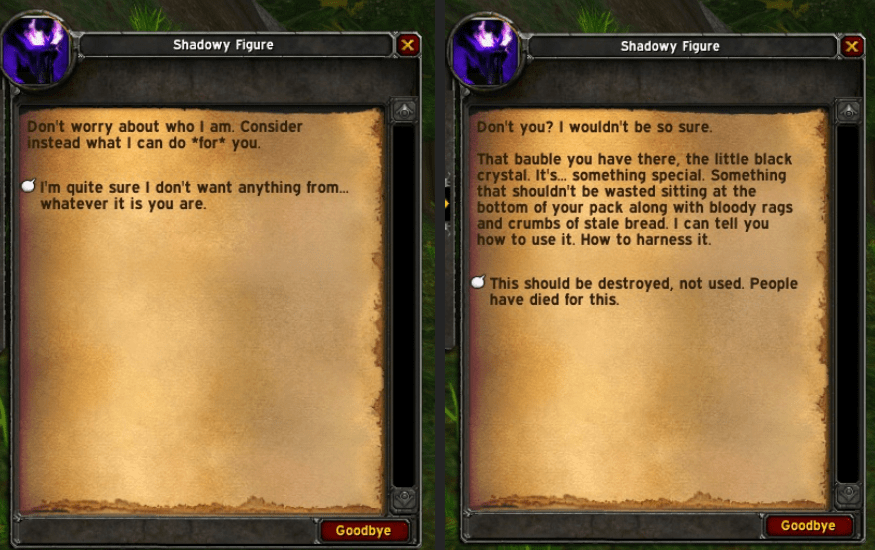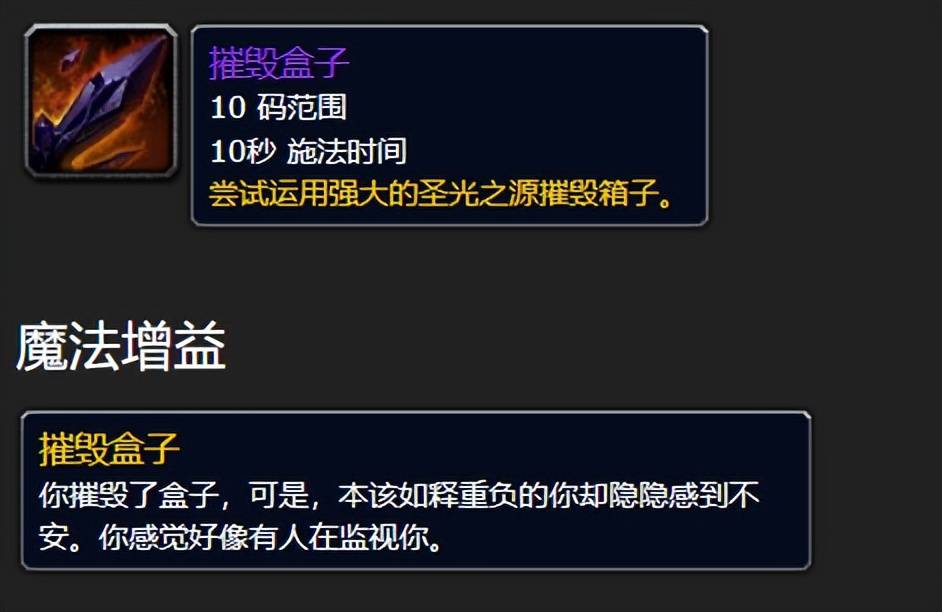 来看探索赛季服,赛季服有一个条虚空之触的任务线,带来裁缝、制皮等专业的25级紫装,其中用到关键道具 “虚空碎片”。任务由一个死亡的暮光教徒开启,从描述得知,他被一个邪恶的存在逼近,迫使他创造“盒子”,然后“她”来了,这个“她”可能就是萨拉塔斯。任务的最后,玩家需要摧毁盒子获得虚空碎片,期间会出现疑似萨拉塔斯的残影。这个影子是一个笼罩在阴影中的女性精灵形态,拿着一把弯曲的匕首,暗夜精灵、血精灵还是虚空精灵都未知,但其邪魅气质很像萨拉塔斯。
