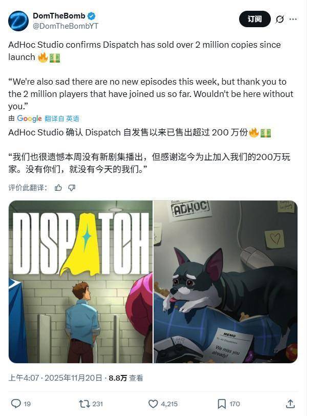 Steam上好评如潮的全新IP《超英派遣中心(Dispatch)》取得骄人成绩:发售不到两周销量超100万,发售一个月销量便突破200万套,Steam获得压倒性的97&好评率,MTC综合均分89分,PS商城评分4.96分,Steam在线峰值超过22万。