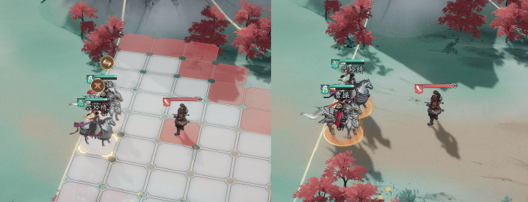 像是下面这张对比图,左右两边看上去只有一点点站位区别而已,但结果可完全不同——由于曹操的普攻距离是一格,吕绮玲的普攻距离是两格,所以在只移动一次的情况下,右侧站位能够让曹操绕到敌人身后触发合击。