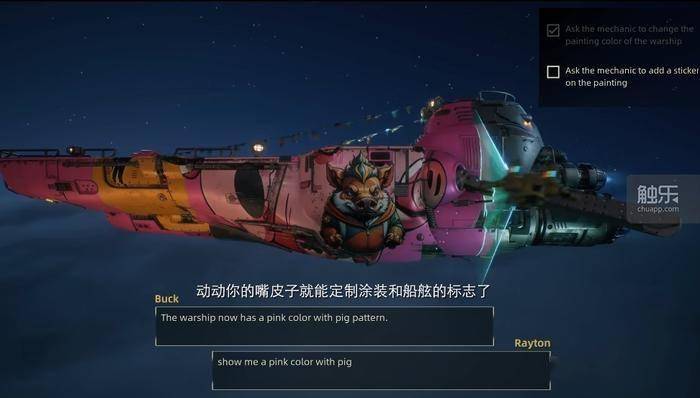 而游戏中的AI涂装系统则既是他们对新技术的进一步尝试,也是有一个“其他人从没做过的方向”。在《动物朋克》中,兔子老雷和同伴们会在某个阶段拥有一个出任务用的飞艇作为载具。玩家可以自定义飞艇的外部涂装,这个涂装样式完全由玩家通过语音输入,让AI生成,相当于拥有无限种自定义皮肤,在风格上又和整体比较硬汉、又有些搞怪的画风相契合。