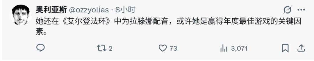 也有网友补充说Jennifer English曾在《艾尔登法环》中饰演拉滕娜,考虑到《艾尔登法环》、《博德之门3》都赢得了年度游戏,而《光与影:33号远征队》刚刚夺得了2025年金摇杆奖年度游戏,三重buff的她被国外网友认为是赢得年度最佳游戏的“关键因素”,甚至是年度游戏的吉祥物。