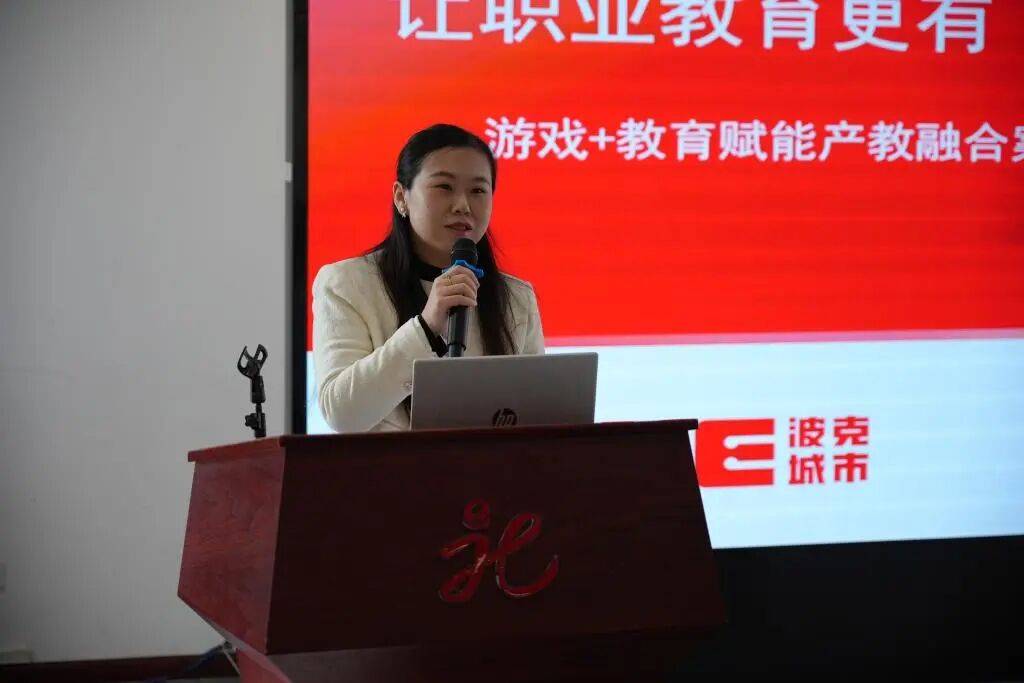 波克科技集团波克教育总监陈苏以“让职业教育更有‘游戏感’”为题,介绍了波克“游戏+”战略在科普、医疗与教育领域的应用,展示了游戏化在社会价值创造中的巨大潜力。她重点分享了波克科技集团在职业教育课程、技能认证和产教融合方面的实践经验,并介绍了企业对金砖国家技能发展与技术创新大赛AI辅助数字角色赛项的技术支持。