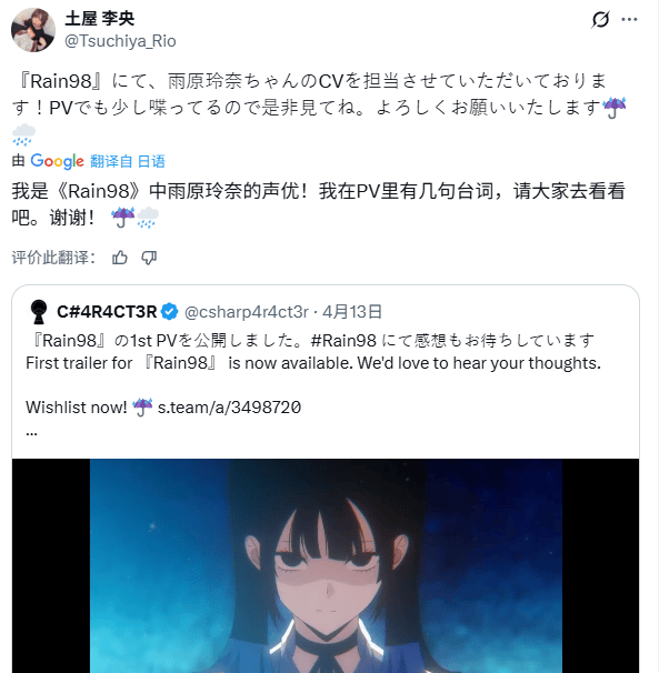 A:这类主题确实非常敏感,所以我们最重视的其实是“避免过度”。自伤、抑郁、共依存这些问题本身就非常纤细,也与一些人生命经历的深处相关,我不希望把它们当作强烈演出的素材去消费。在《Rain98》中,它们不是故事的装饰,而是玲奈身上静静存在的一部分,我希望以谨慎的态度去描绘她的伤痛。