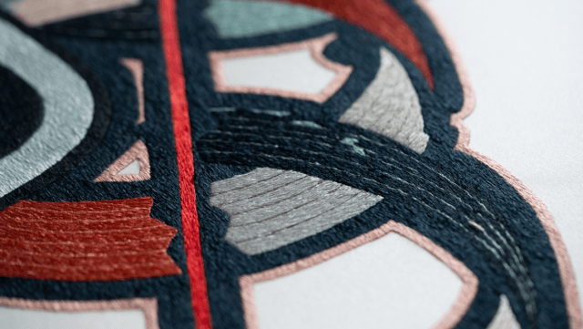 以Lhor Jung Roei战队的战旗为例。绣品中红蓝线条的主体轮廓用了齐针,针脚细密平齐,让边缘清晰规整;叶片部分则顺着叶脉方向排列丝线,既还原了叶片的自然纹理,也让立体感更明显;整个图案的蓝色外边缘用了“扣针”,针脚呈“V”形环绕边缘,既加固了绣品的外轮廓,防止绣线脱散,又让边缘有轻微的凸起质感,和内部的平面绣形成层次对比,让图案更醒目,四大名绣之首实至名归!