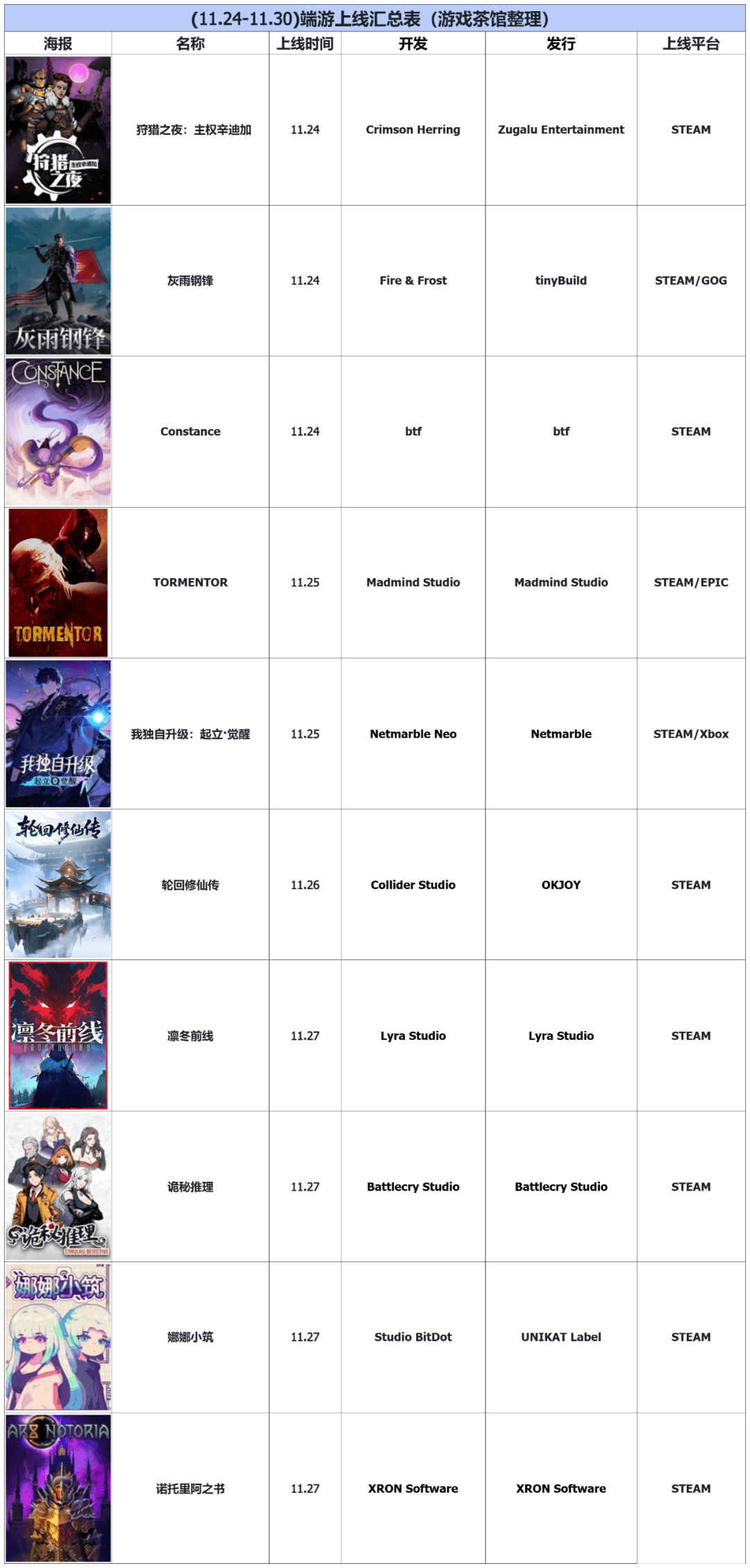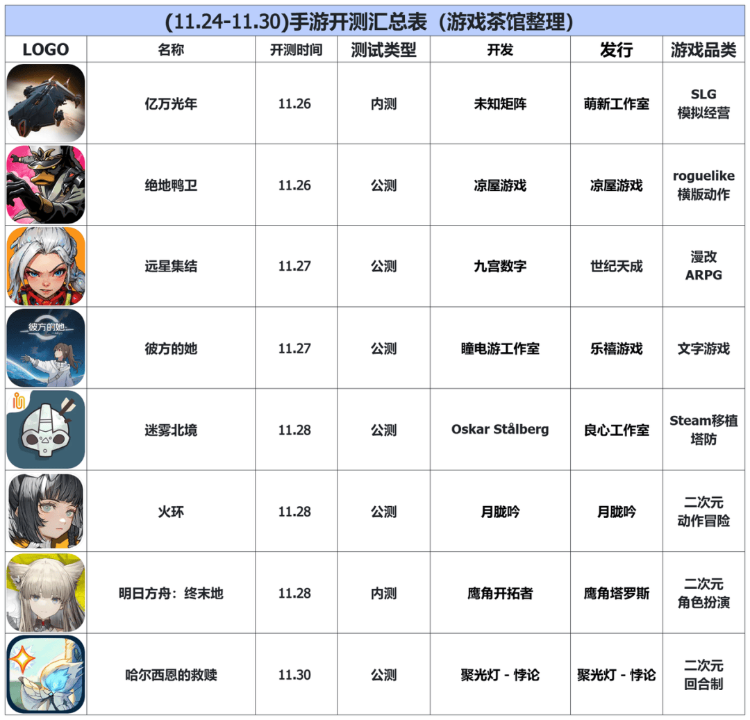 游戏茶馆整理了下一周内(11.24-11.30)即将上线的新游戏。