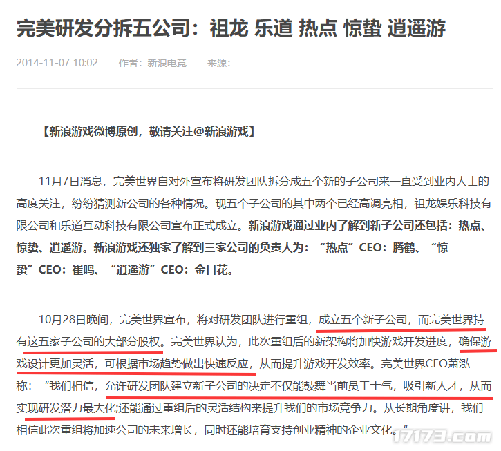 2014年11月,完美世界正式公布子公司拆分计划,从中拆分出祖龙、乐道、热点、惊蛰、逍遥游五家独立研发公司。这些新公司不仅获得自主对接投资方的权限,核心战略方向也毫无悬念地聚焦于当时大热的手游领域。