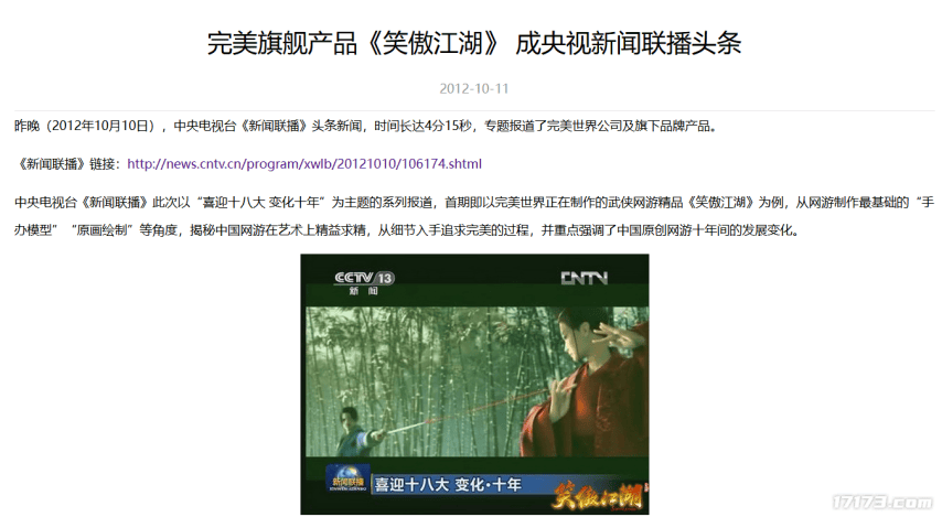 更夸张的是,完美还将游戏顶上央视“新闻联播”的高度,2012年10月1日,新闻联播长达4分15秒的浓墨重彩的介绍,让《笑傲江湖》着实赚足了眼球。上一个有此殊荣的游戏还是《魔兽世界》。