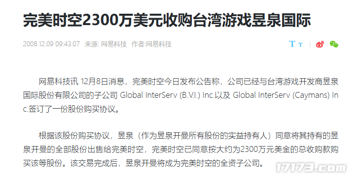 2008年10月,完美时空以1500万美元,将《流星Online》《笑傲江湖》的版权及昱泉跨平台引擎的使用权收入囊中。