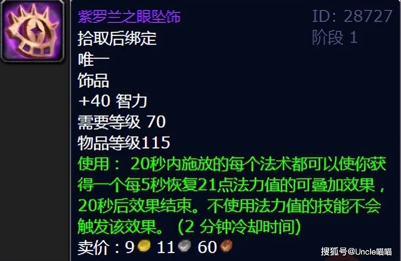 卡拉赞这个前期小团本乃是喵叔最爱的副本之一,掉落装备经典异常,其中紫罗兰之眼坠饰的无解理由,就简单的是为了奶骑大兄弟的那份荣耀了,高智力搭配奶骑天赋堪称无敌,而且还有被动续航,对于这个职业而言必须满分!